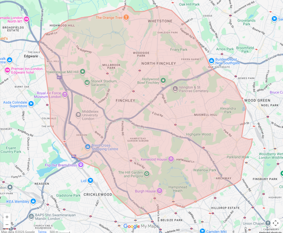 This map highlights the primary areas we cover, including Colindale, Hendon, Brent Cross, Golders Green, Hampstead, Archway, Highgate, Muswell Hill, Finchley, and North Finchley. We may also offer services outside these areas, depending on availability and upon request. If you're unsure whether we can reach you, don't hesitate to contact us.